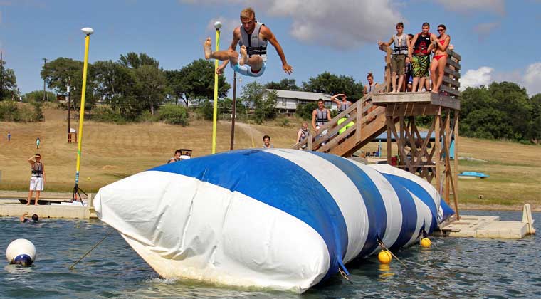 Originally, “blobs" were giant inflatable bladders used as Naval fuel tanks towed behind ships to refuel them as necessary (gasoline and oil float on water). Over time, Naval sailors recognized boredom and sought to combat it. They quickly identified an ally in the war on monotony and recruited these fuel bags, launching fellow seamen out into the abyss. These “blobs" made their way to the recreational industry for the first time at a summer camp in Texas. Modern day blobs include a brave flyer sitting on the end of a semi-inflated airbag who is launched into the water by their camp-mates. The catapulted daredevils perform cartwheels, back-flips, cannonballs, front flips, corkscrews, and side flips. Of course smaller launches can be orchestrated for those new to the thrill of the blob.